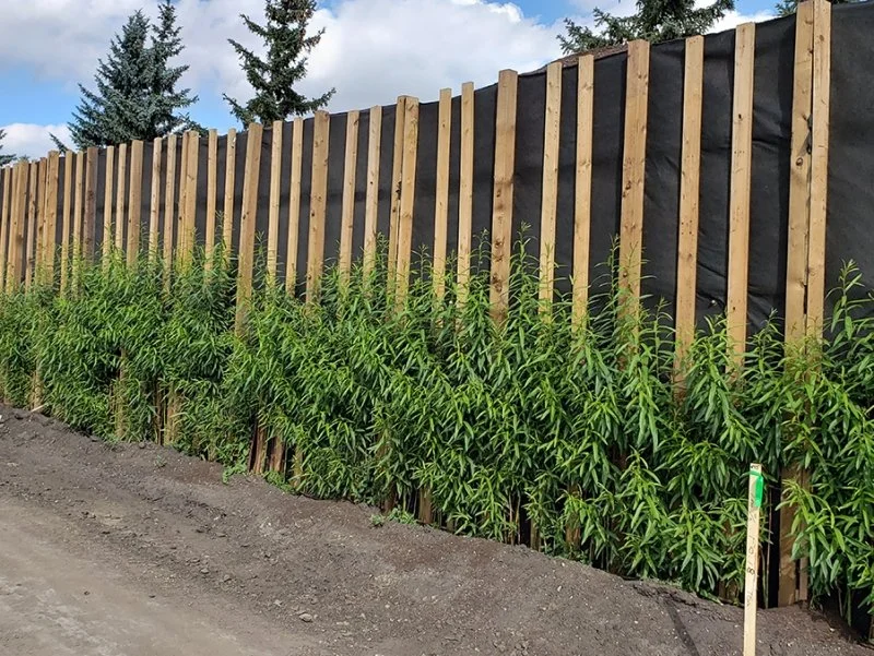 The Tweddle Park Living Wall is a structure made of a wooden frame, with earth and willow shrubs growing on it. The wall provides a natural sound barrier and visual screen for the residences that back onto 91 Street. It’s also graffiti resistant, low maintenance and sustainable.